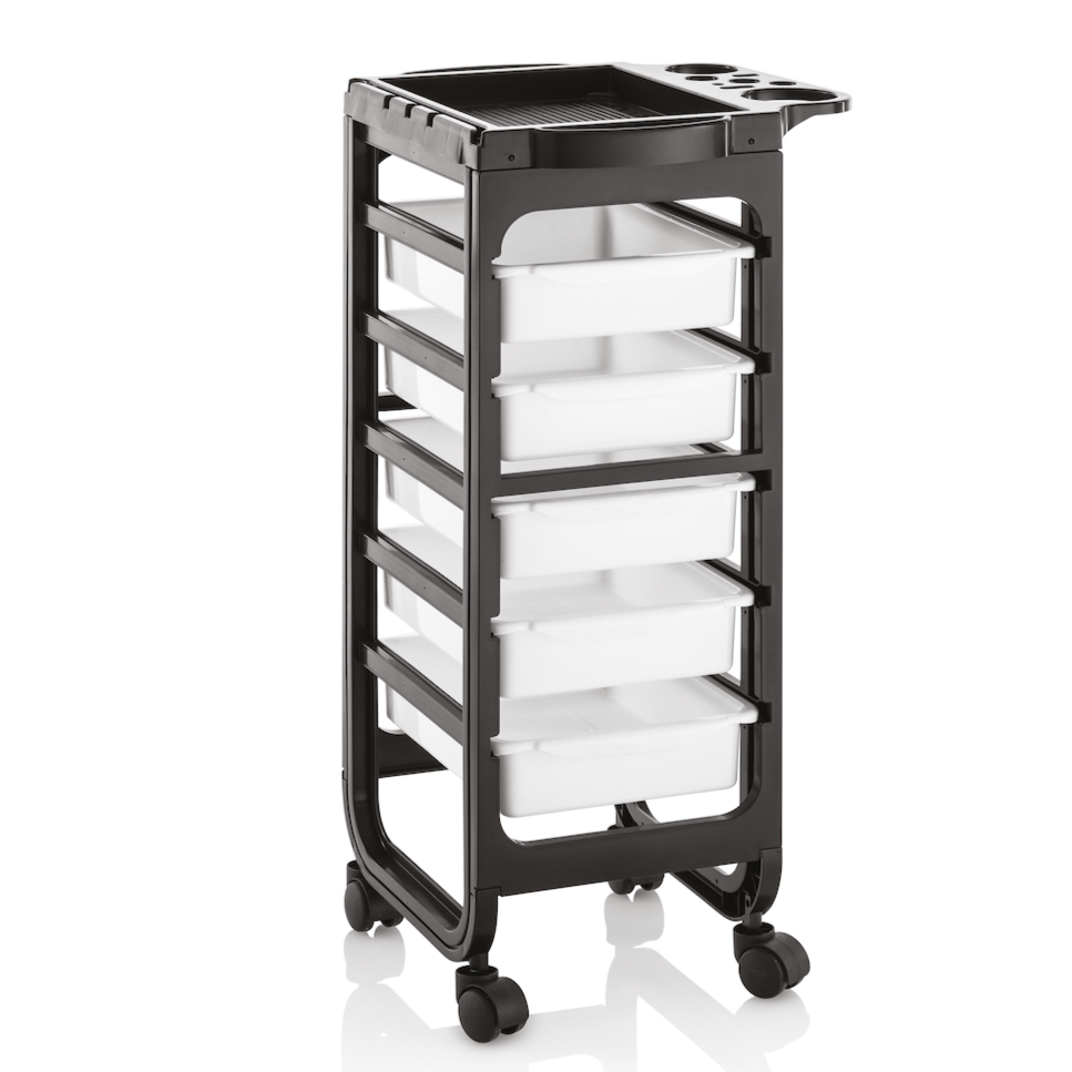 Il carrello porta attrezzi BARCELLONA, con struttura in plastica resistente, è dotato di cinque cassetti estraibili per un’organizzazione ottimale degli strumenti del tuo salone da parrucchiere.