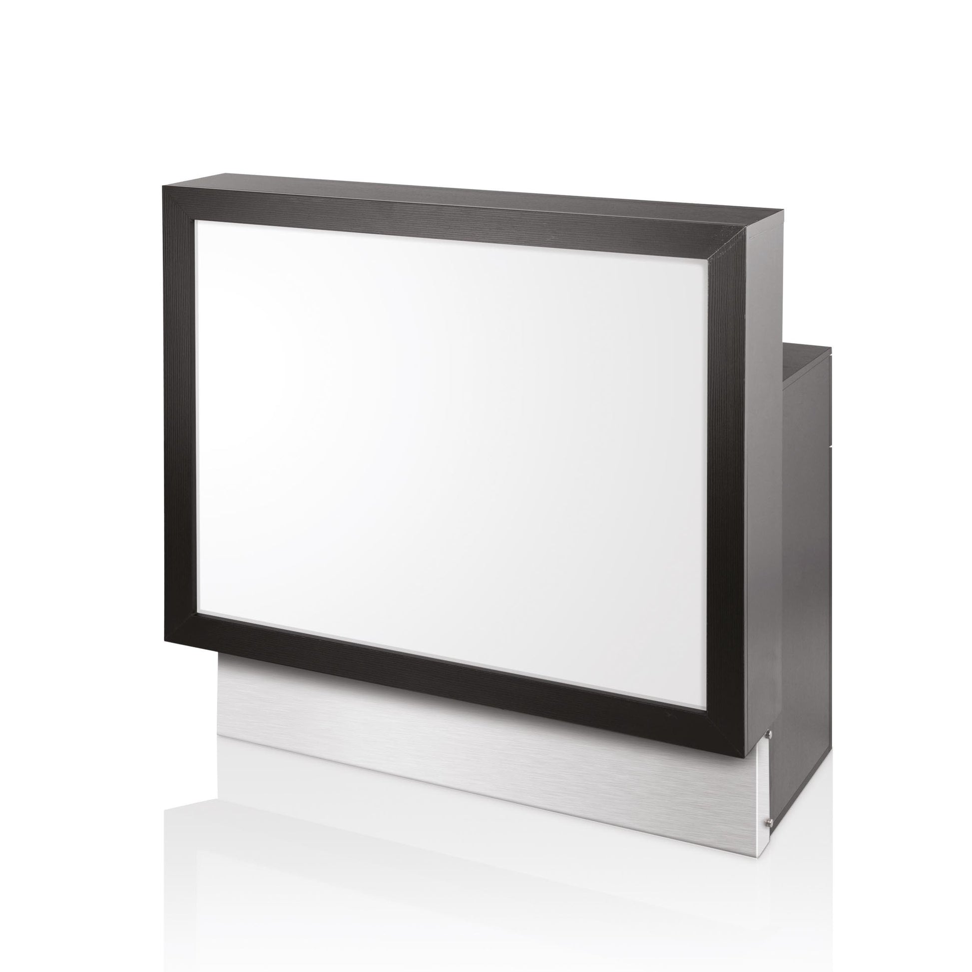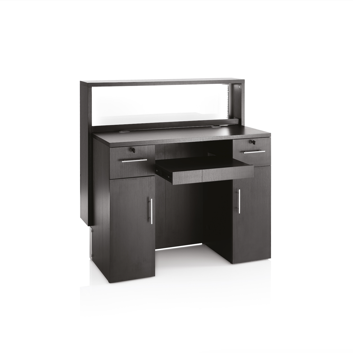 La BARLUX CONSOLLE è un banco reception moderno con struttura in legno nero e frontale retroilluminato, che aggiunge un tocco di eleganza al salone. Completo di un mobile retro cassa, offre funzionalità e ampio spazio per l’organizzazione, creando un'area accogliente e professionale.