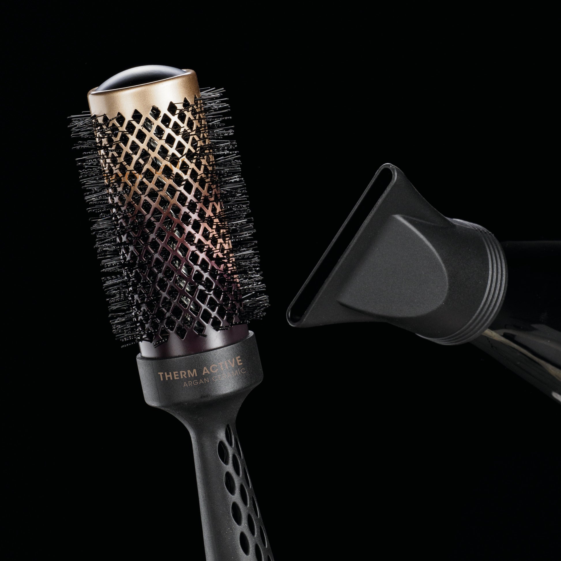 Tecnologia Thermo Active. Il calore diretto sulla spazzola raggiunti i 60C°, cambierà colore al fusto, attivando le proprietà del rivestimento in ceramica infuso in olio di argan.