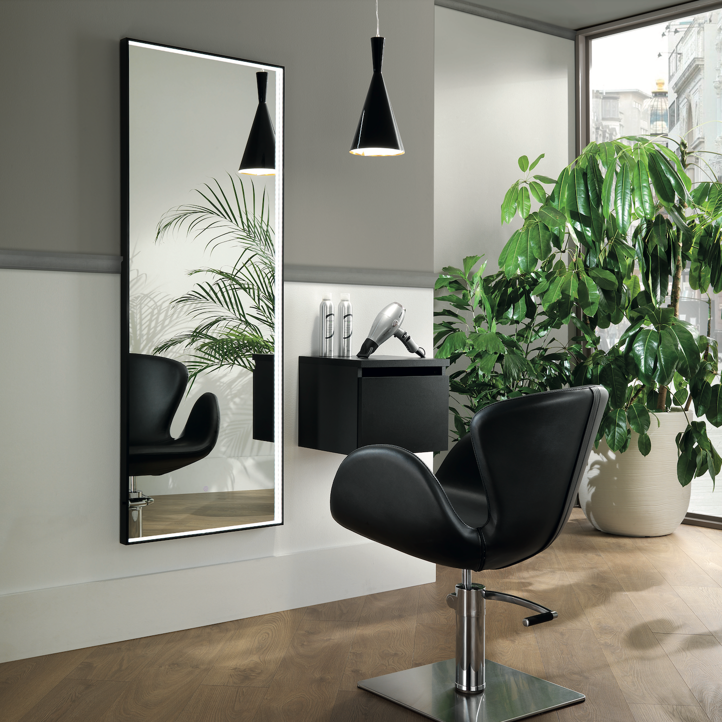 CIELO è uno specchio rettangolare con luce a LED, perfetto per un salone da parrucchiere.