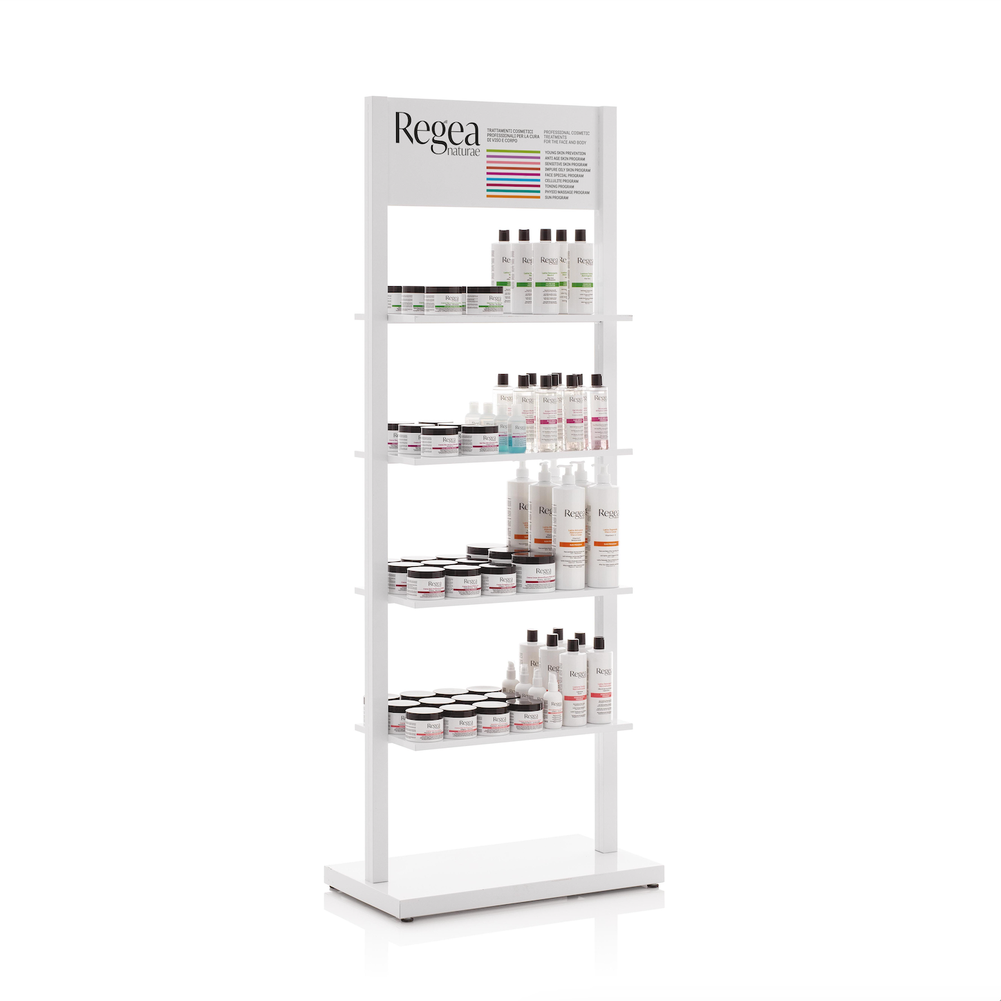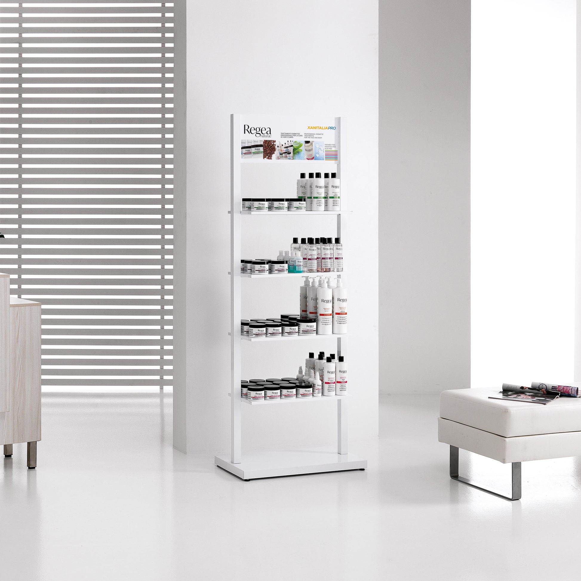 L'espositore bifacciale DOUBLE-SIDED DISPLAY, con struttura in metallo verniciato bianco, è perfetto per riporre in maniera ordinata l'attrezzatura da lavoro per il tuo salone da parrucchiere. Dotato di piedini regolabili in altezza, garantisce stabilità e versatilità per ogni esigenza espositiva.