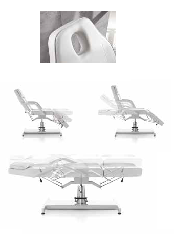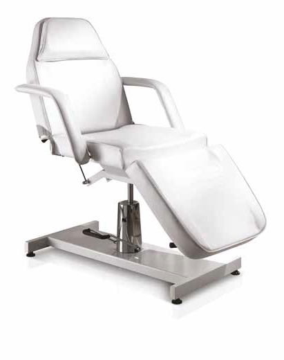 Lettino a 2 snodi con regolazioni auto bloccanti, Pompa idraulica per la regolazione dell’altezza, Struttura in acciaio, Braccioli asportabili, Rivestimento in sky ecopelle bianco.