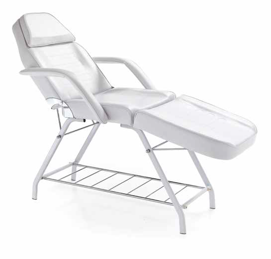 Lettino per estetica a 2 snodi con regolazioni autobloccanti, Struttura in acciaio cromato, Rivestimento in sky ecopelle bianco, Braccioli asportabili, Piano portaoggetti.