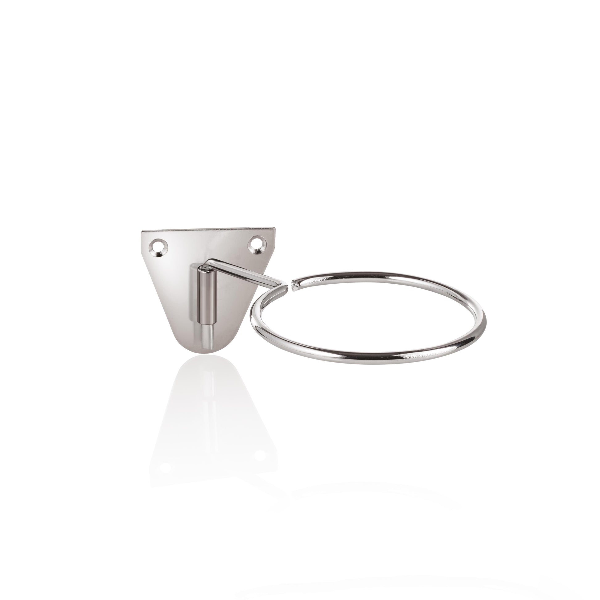 Porta asciugacapelli da parete circolare in acciaio cromato, dal design minimal e funzionale. Facile da montare, offre una soluzione pratica per tenere l'asciugacapelli in ordine e a portata di mano, adatto sia per uso domestico che professionale.