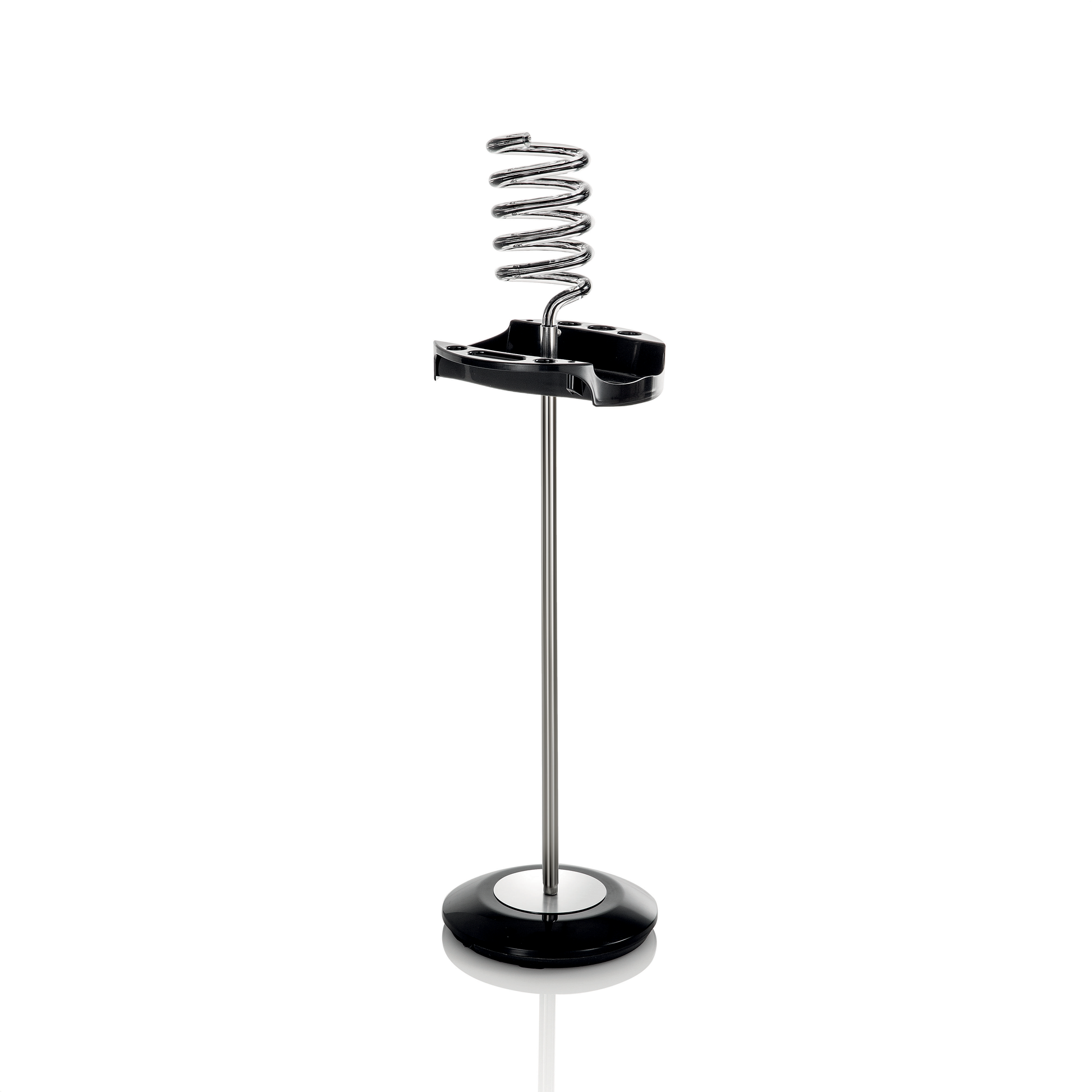 Porta asciugacapelli da terra con supporto a spirale in metallo e base stabile. Dotato di scomparti aggiuntivi per accessori, è ideale per un'organizzazione pratica ed elegante del bagno o del salone.