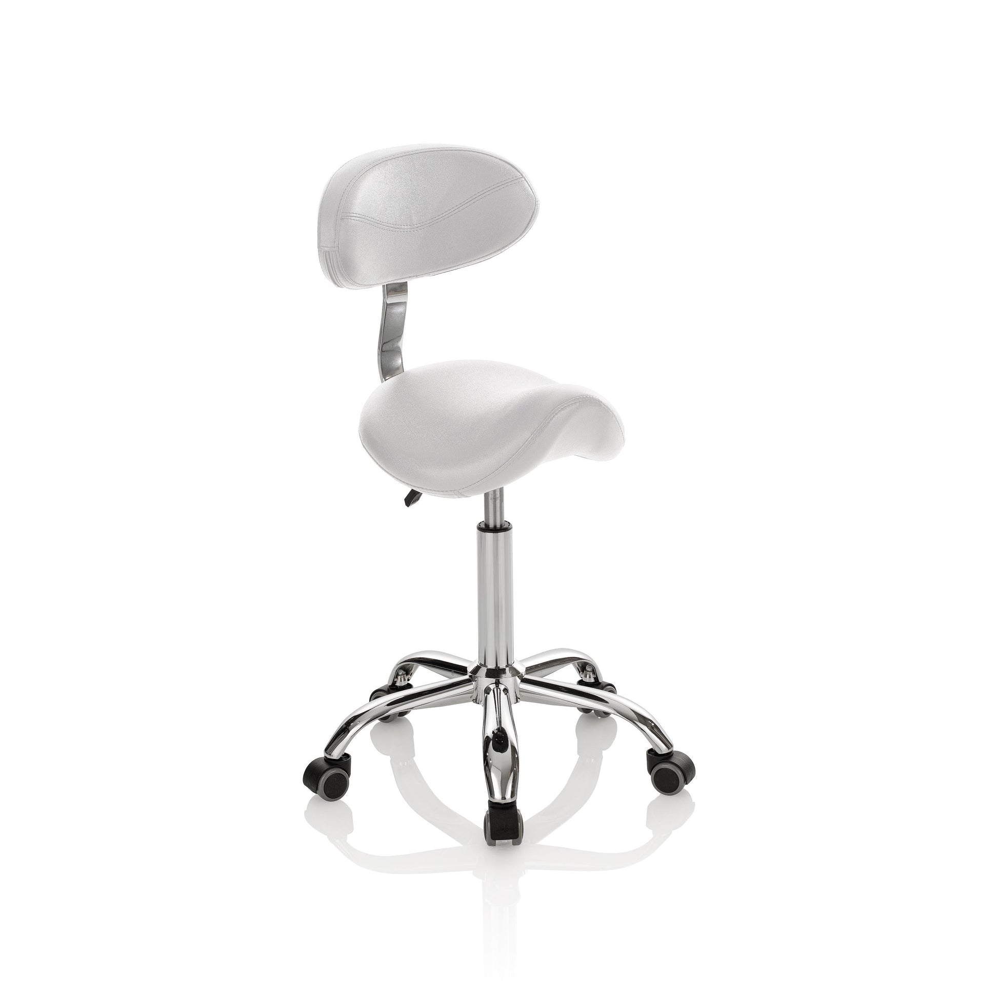 SALON DAY, lo sgabello a sella con schienale, completa l’arredo del salone, aiuta durante il taglio o solo per sedersi e prendere appuntamenti alla reception.