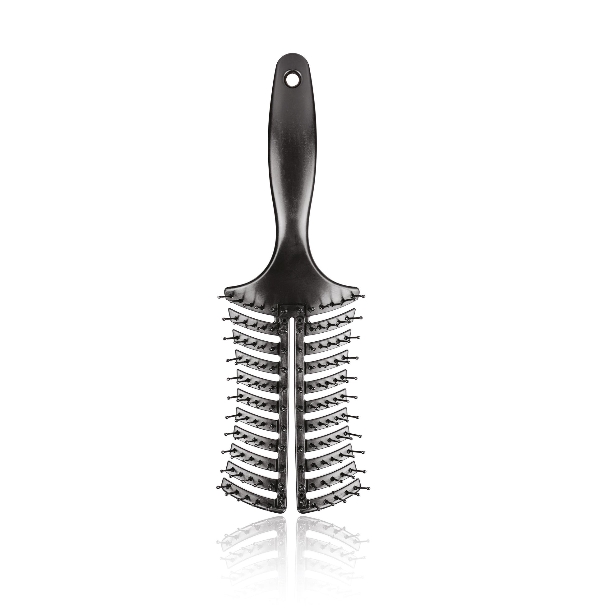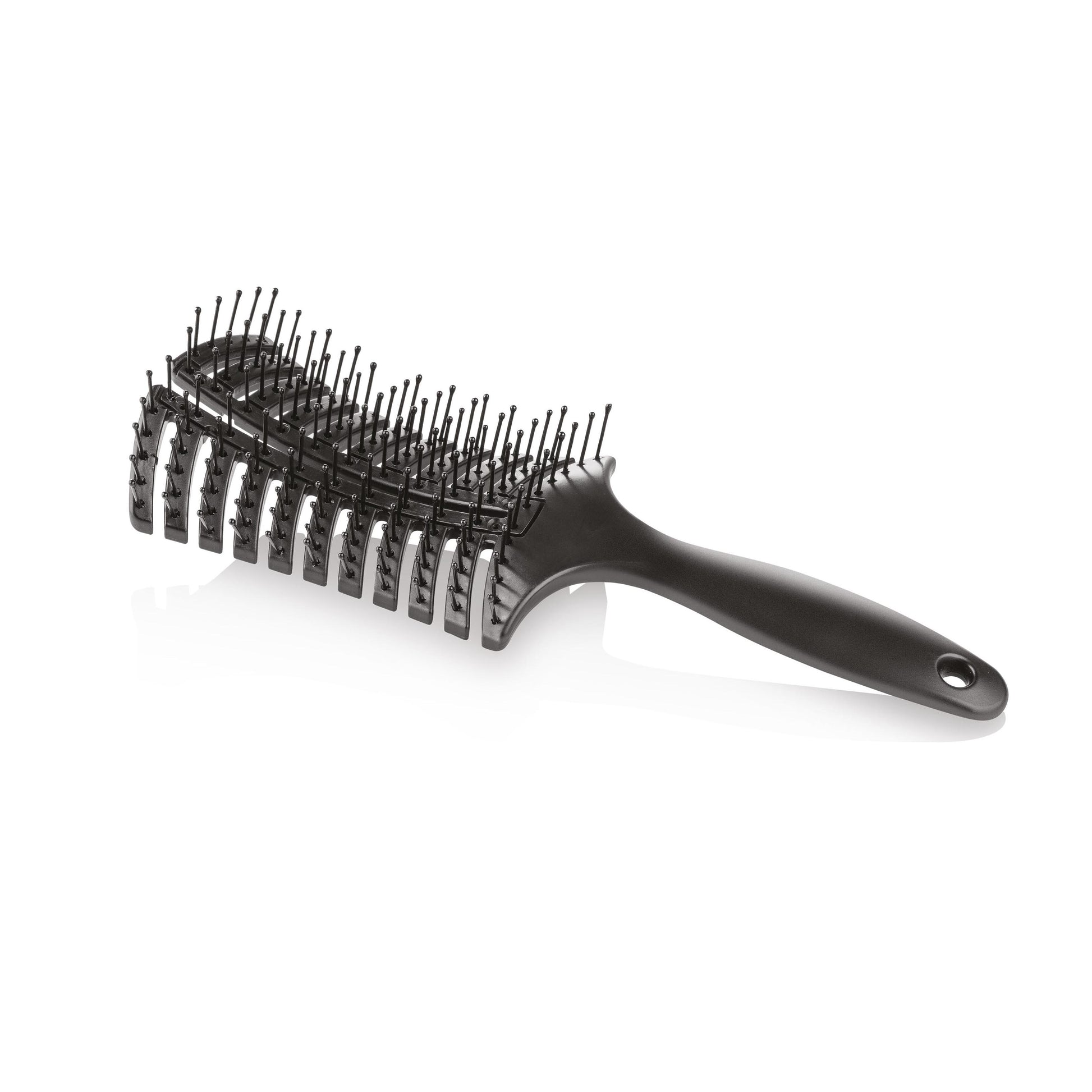 Spazzola districante con setole in nylon, con curva anatomica e griglia di aerazione, per un asciugatura delicata e veloce.