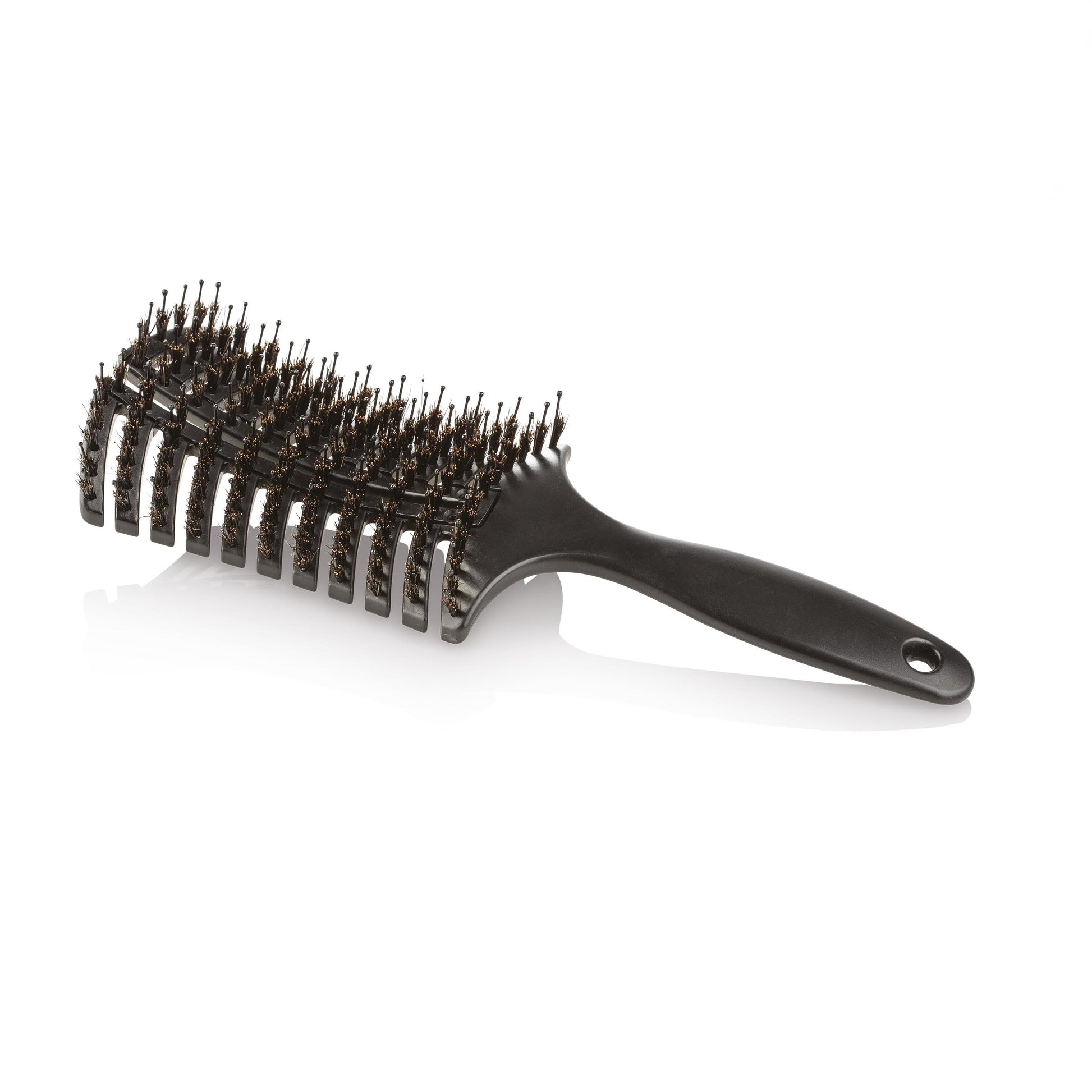 Spazzola con setole in nylon e pura setola di cinghiale, con curva anatomica e griglia di aerazione, per un asciugatura delicata e veloce.