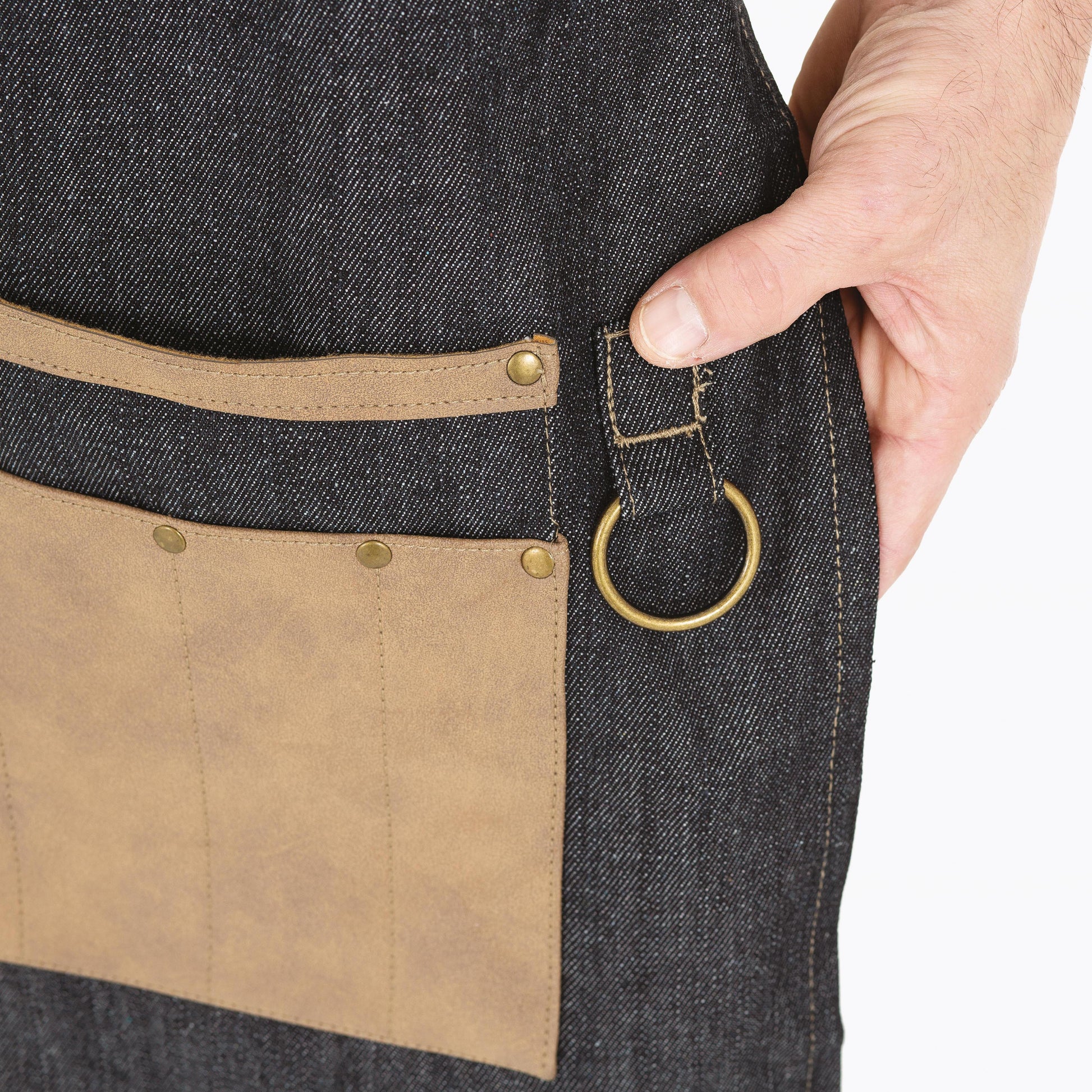 Tom, grembiule da barbiere in tessuto denim, con inserti in ecopelle e spalline regolabili. Dotato anche di tasche porta attrezzi.