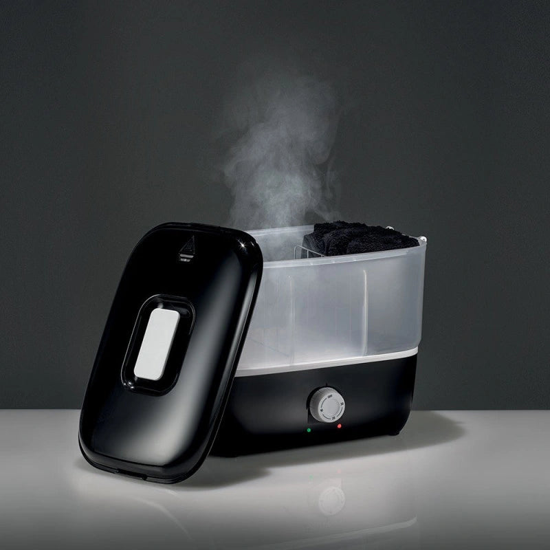 Towel Express, scaldasalviette a vapore per centri estetici e parrucchieri. Leggero e compatto, con vassoio portasalviette estraibile e timer regolabile. Emette vapore in 10 secondi.